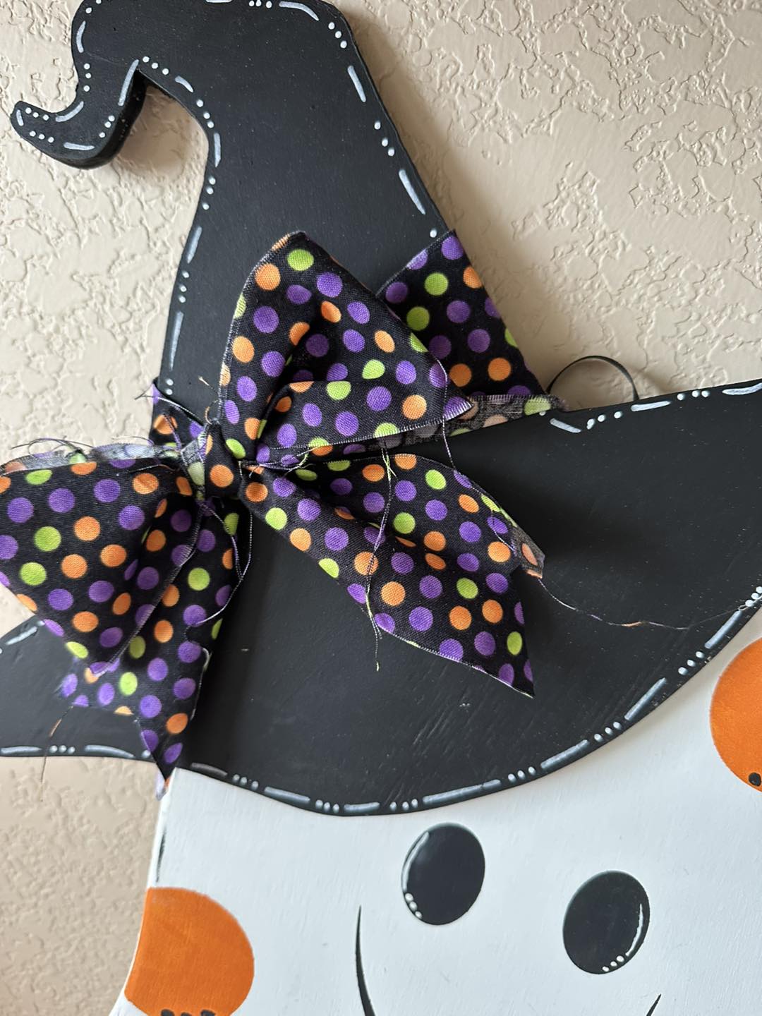 Elevate your Halloween décor with this expertly crafted Witches Hat Ghost Door Hanger. Designed for home use, it combines a whimsical ghost figure wearing a classic witch’s hat to create a festive and inviting entrance. Durable and easy to hang, this door hanger adds a touch of seasonal charm while setting the perfect spooky yet friendly tone for your holiday celebrations.