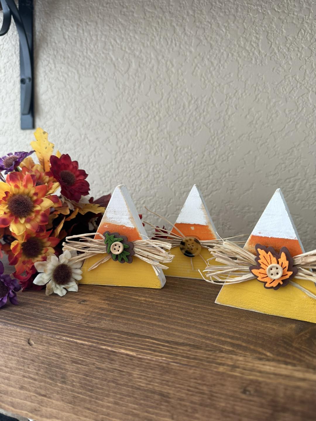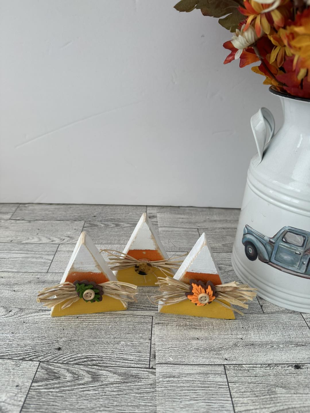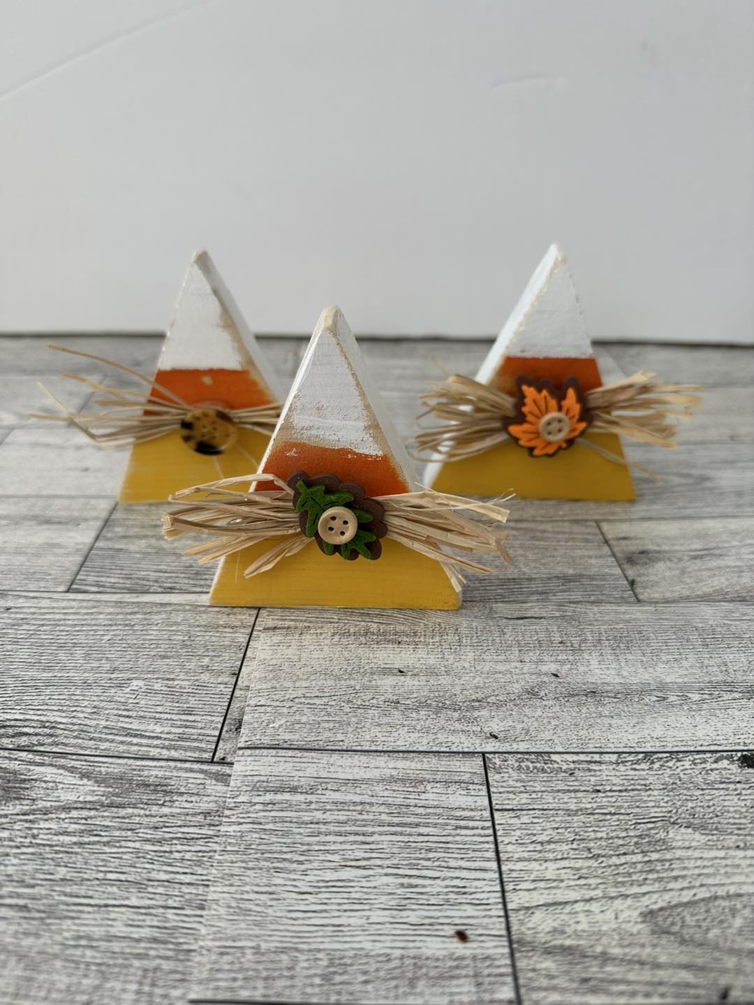 Do you love to eat candy corn or just decorate with it? This adorable set will come with 3 wooden candy corns. They will come packaged in an adorable cellophane bag. Perfect for gift giving or keeping for yourself.